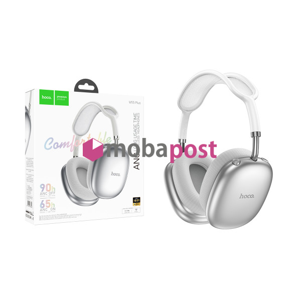 Беспроводные наушники Hoco W55 Plus — накладная модель серебристого цвета с активным шумоподавлением (ANC). Работают по Bluetooth 5.4 и поддерживают проводное подключение через AUX. Встроенный аккумулятор ёмкостью около 800 мА·ч обеспечивает до 90 ч работы без ANC и около 65 ч с включённым ANC. Вес — примерно 198 г, амбушюры мягкие, оголовье регулируемое, подходит для длительного использования. Подходят для музыки, звонков и просмотра фильмов.