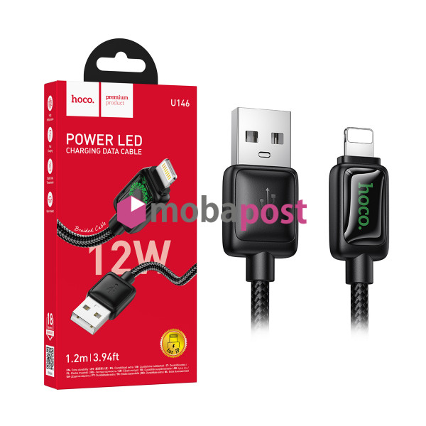 Кабель USB - Lightning Hoco U146 (12W, оплетка нейлон, 1.2 м) Черный