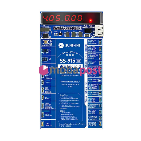 Плата активации и зарядки аккумуляторов Sunshine SS-915 V9.0 — это универсальное устройство, предназначенное для работы с аккумуляторами смартфонов iPhone (от моделей 6 до 15 Pro Max) и Android (Samsung, Huawei, Xiaomi, Oppo, Vivo и др.). Она обеспечивает быструю активацию и зарядку аккумуляторов без необходимости их установки в смартфон, что делает её незаменимым инструментом в сервисных центрах и мастерских по ремонту мобильных устройств.