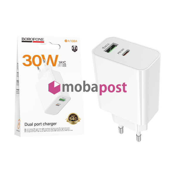 Сетевое зарядное устройство USB/Type-C Borofone BA108A (30W, QC3.0, PD, 2 порта) Белый — это мощное и универсальное зарядное устройство, оснащенное двумя портами — USB и Type-C, что позволяет заряжать два устройства одновременно. Поддержка технологий Quick Charge 3.0 (QC3.0) и Power Delivery (PD) обеспечивает быструю и эффективную зарядку, позволяя заряжать смартфоны, планшеты, наушники и другие устройства с поддержкой этих стандартов на высокой скорости.