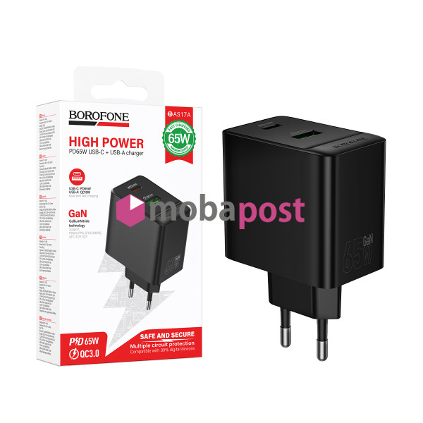 Сетевое зарядное устройство Borofone BAS17A — мощное и универсальное решение для быстрой и безопасной зарядки современных гаджетов в элегантном чёрном корпусе. Оно поддерживает мощность до 65 Вт и протоколы Power Delivery (PD) и Quick Charge 3.0 (QC 3.0), что позволяет эффективно заряжать смартфоны, планшеты и компактные ноутбуки. Зарядное устройство оснащено двумя выходными портами — USB‑Type‑C и USB‑A, позволяя одновременно подключать два устройства. Компактный и прочный корпус защищает от перегрева, короткого замыкания и перегрузки, а универсальный входной диапазон обеспечивает возможность использования в поездках по всему миру. Borofone BAS17A сочетает высокую скорость зарядки, надёжность и стильный дизайн, делая процесс подзарядки комфортным и безопасным.