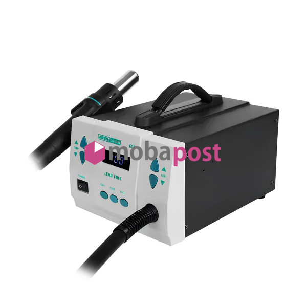 Мощная паяльная станция с термовоздушным феном мощностью 1000 Вт, обеспечивающая широкий диапазон температур от 100 до 500°C для точного и быстрого нагрева при пайке и демонтаже электронных компонентов.