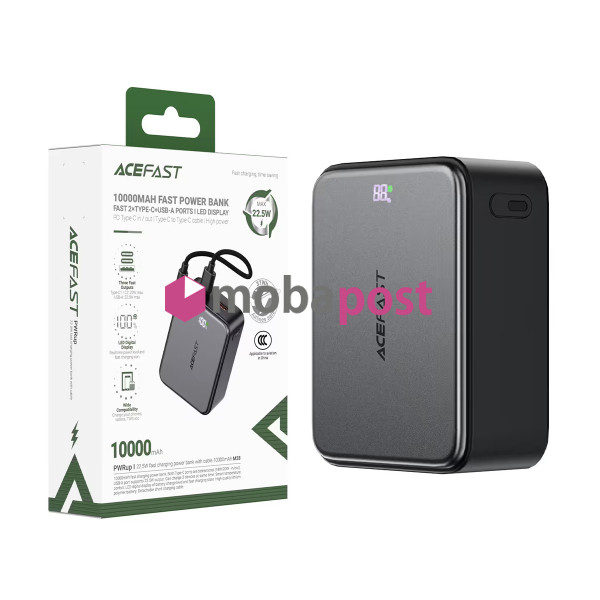 Внешний аккумулятор (Power Bank) Acefast M28 10000 mAh (22.5 W, PD, Type C, кабель Type C), черный — компактный и мощный переносной зарядный аккумулятор для смартфонов, планшетов и других гаджетов. Объём батареи 10000 mAh обеспечивает несколько циклов подзарядки популярных устройств, что делает его идеальным спутником в поездках, путешествиях и повседневной жизни.