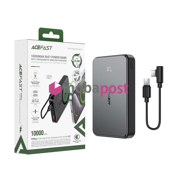 Внешний аккумулятор (Power Bank) Acefast M31 10000 mAh (22.5 W, PD, MagSafe 15 W, Type C, кабель Type C, LED дисплей), черный — универсальный и функциональный портативный аккумулятор, который позволяет заряжать смартфоны, планшеты, наушники и другие устройства без доступа к розетке. Ёмкость 10000 mAh обеспечивает несколько циклов подзарядки популярных гаджетов, что делает Power Bank идеальным спутником в поездках, командировках и повседневной жизни.